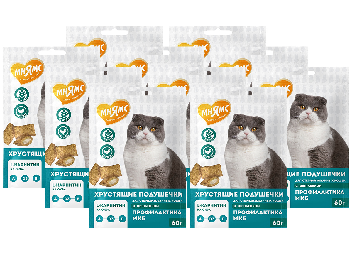 Лакомство для стерилизованных кошек МНЯМС ПРОФИЛАКТИКА МКБ хрустящие подушечки цыпленок, клюква (60 гр х 10 шт)