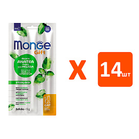 Лакомство для взрослых кастрированных котов и стерилизованных кошек MONGE GIFT STERILISED мягкие палочки утка, мелисса лекарственная, клюква 15 гр (1 шт х 14)