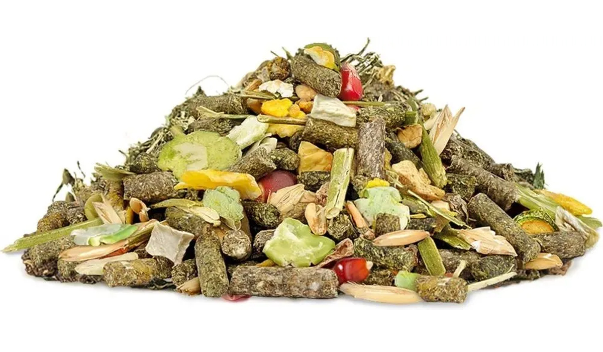 Корм состоит из травяных гранул, плющеных зерен, сушеных овощей, сушеной люцерны и плодов рожкового дерева, а кусочки сушеного яблочка делают корм не только полезным, но и очень вкусным!