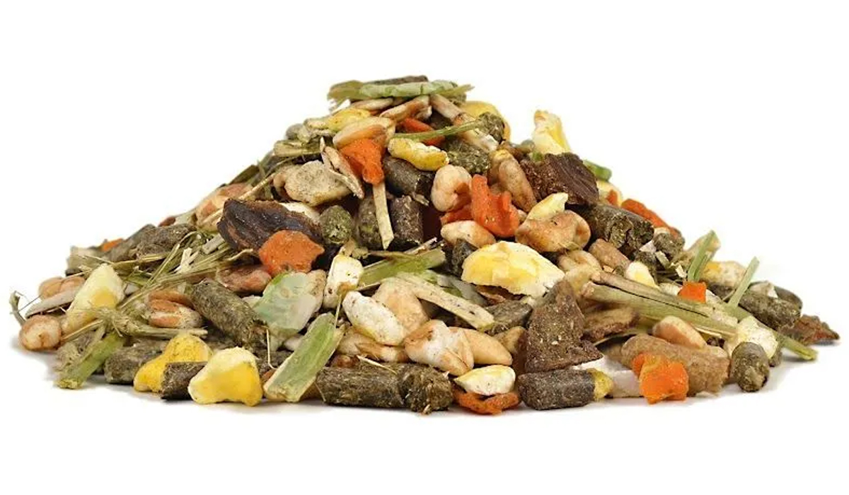 Корм обогащен сушеными овощами, плющеными бобами, плодами редких растений.