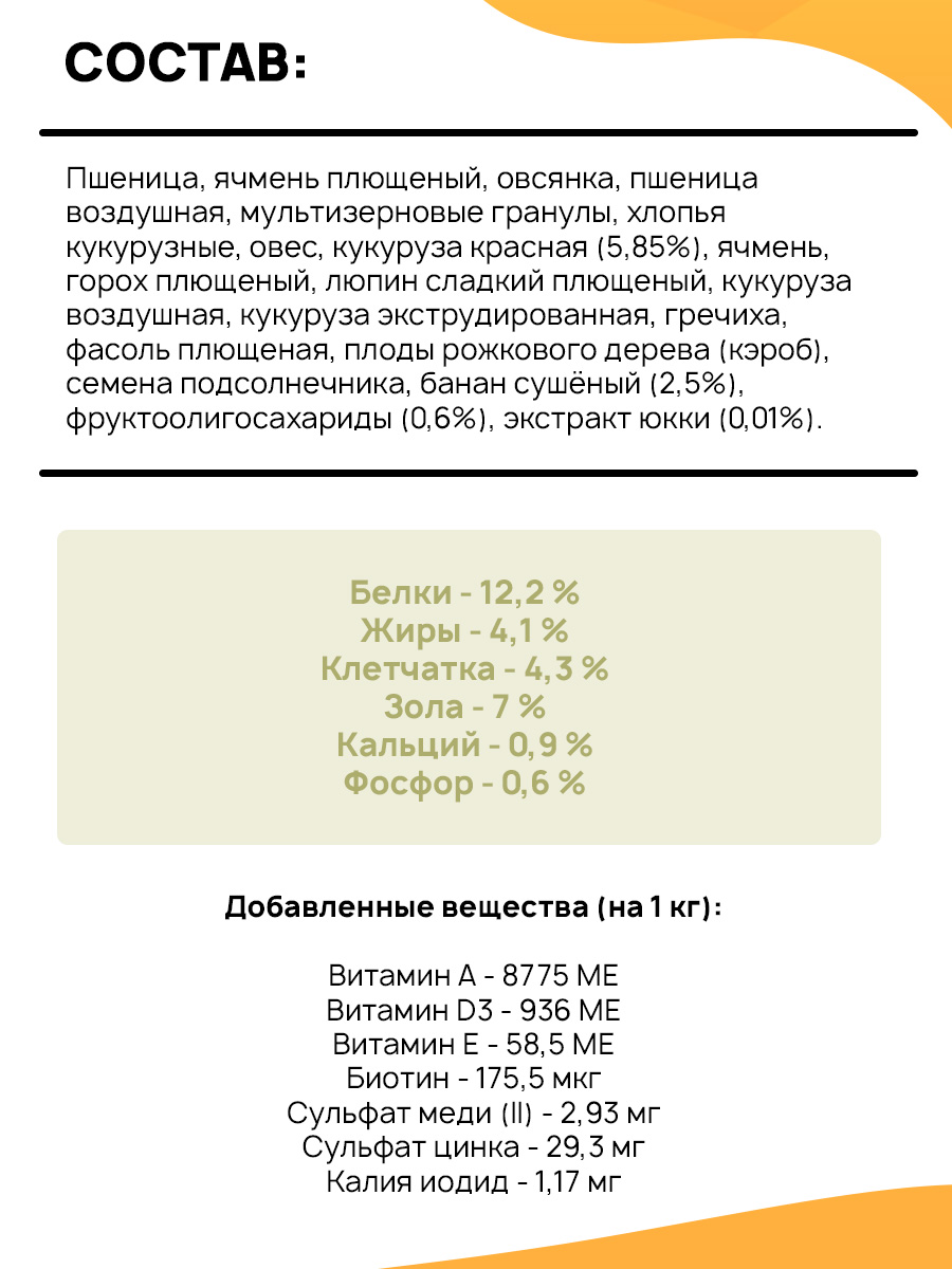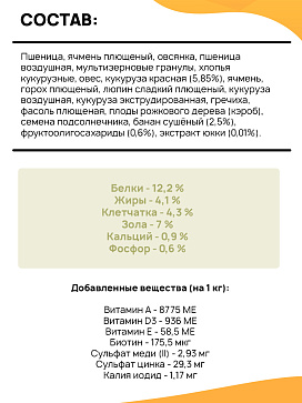 Пшеница, ячмень плющеный, овсянка, пшеница воздушная, мультизерновые гранулы, хлопья кукурузные, овес, кукуруза красная (5,85%), ячмень, горох плющеный, люпин сладкий плющеный, кукуруза воздушная, кукуруза экструдированная, гречиха, фасоль плющеная, плоды рожкового дерева (кэроб), семена подсолнечника, банан сушёный (2,5%), фруктоолигосахариды (0,6%), экстракт юкки (0,01%).