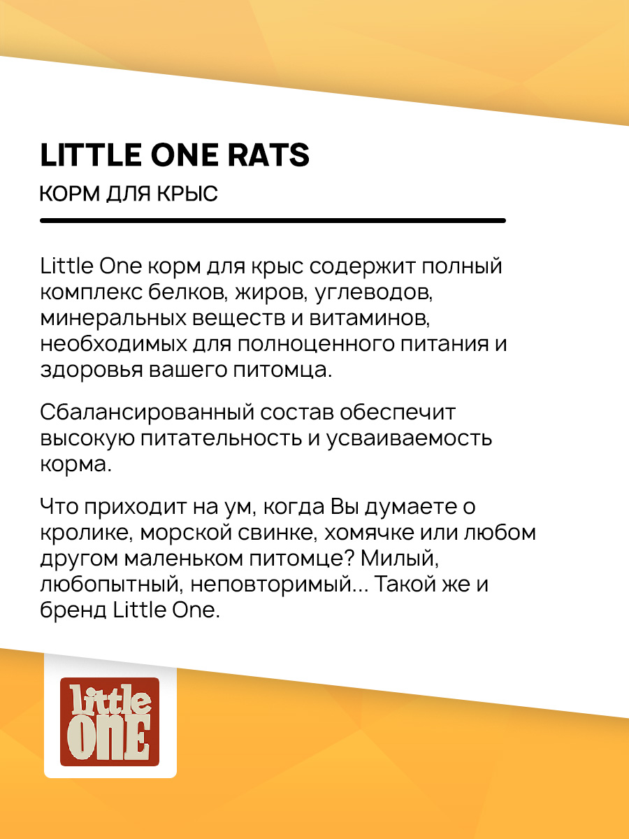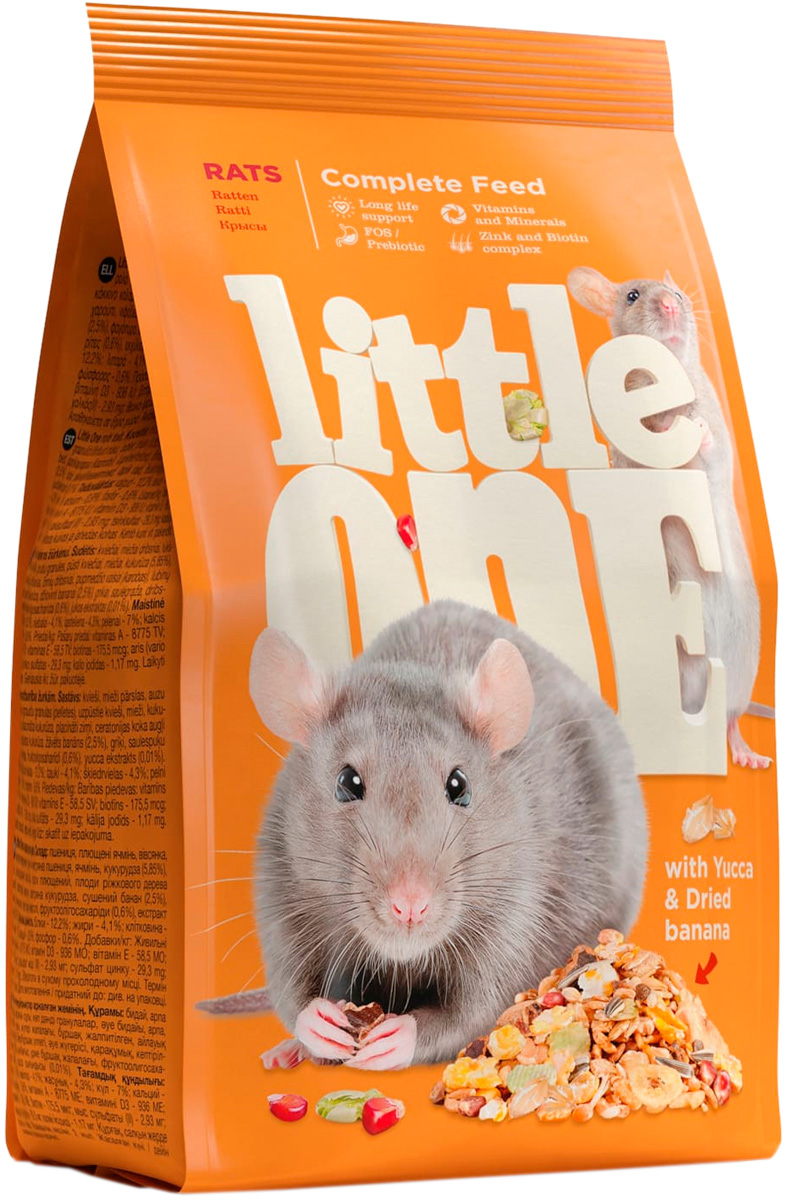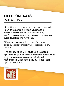 Little One корм для крыс содержит полный комплекс белков, жиров, углеводов, минеральных веществ и витаминов, необходимых для полноценного питания и здоровья вашего питомца.