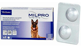 Мильпро дог для крупных собак мильбемицин оксима - 12,5 мг и празиквантела - 125 мг.