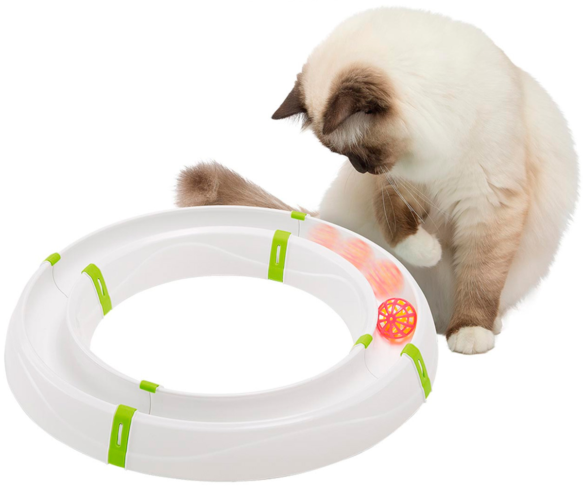 Игрушка в виде пластикового желобка, по которому питомец увлеченно гоняет по кругу яркий пластиковый шарик. Конструкция желобка не позволяет его просто вынуть. Игрушка состоит из элементов, которые легко собираются.