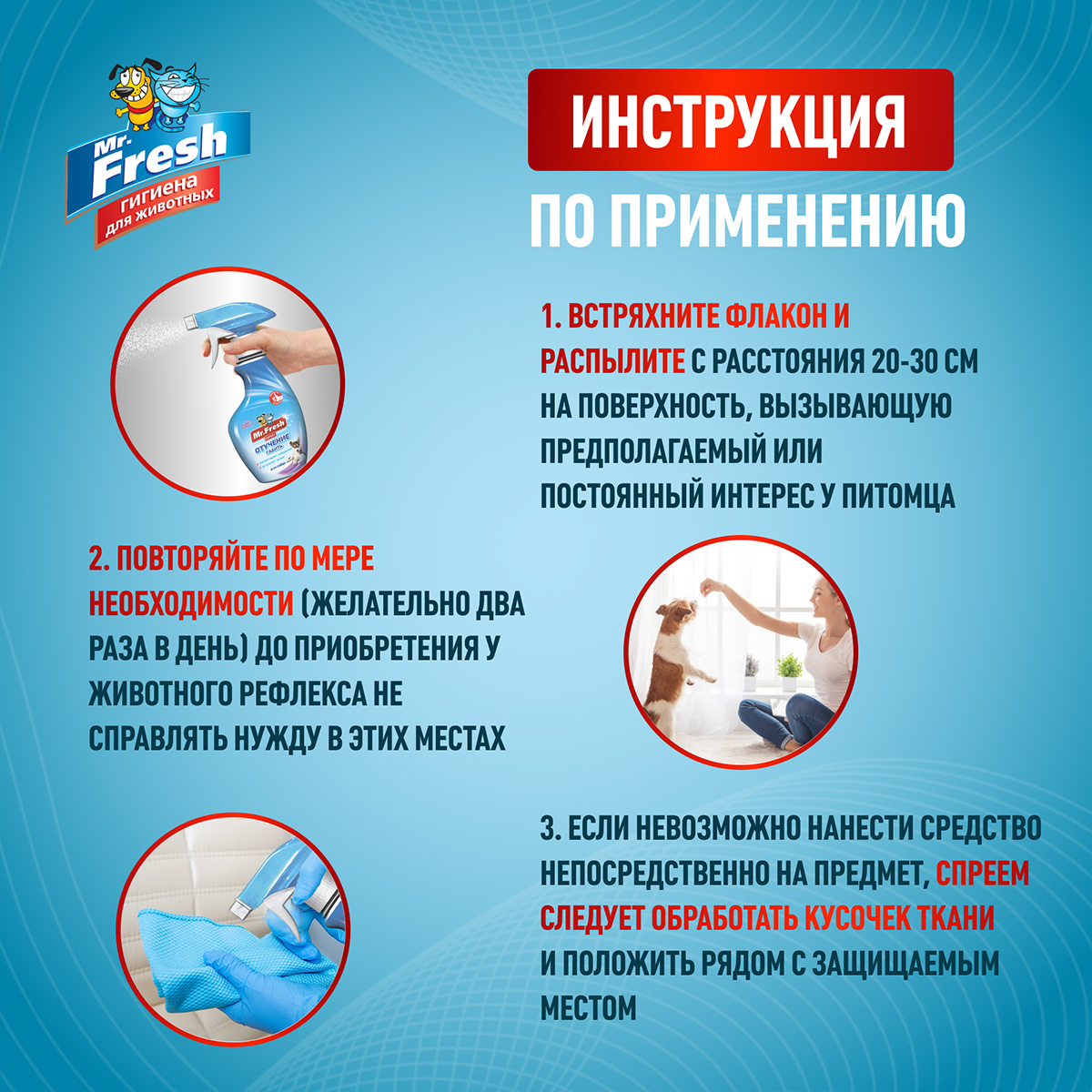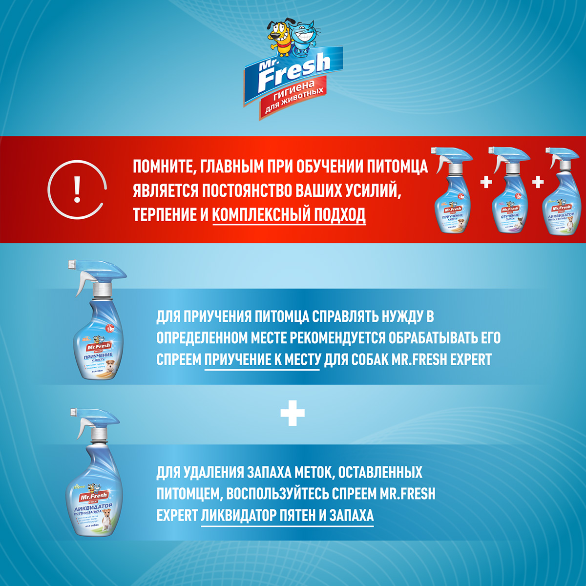 Содержание животных требует от хозяев большой ответственности и постоянной заботы о чистоте и порядке в доме. Не всегда наши питомцы чистоплотны и корректны в поведении и повадках. MR. FRESH – серия современных гигиенических средств по уходу за домашними животными, созданная совместно с европейской фирмой Veterinar Bio(Германия). Средства MR. FRESH EXPERT помогут Вам приучить Ваших питомцев к порядку и содержать дом в чистоте.