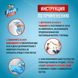 Встряхните флакон и распылите средство с расстояния 20-30 см на поверхность, вызывающую предполагаемый или постоянный интерес животного. Повторяйте обработку по мере необходимости (желательно 2 раза в день) до приобретения у животного рефлекса не справлять нужду в этих местах. При невозможности нанесения средства непосредственно на поверхность или растение следует обработать препаратом кусочек ткани и положить его рядом с защищаемым местом.