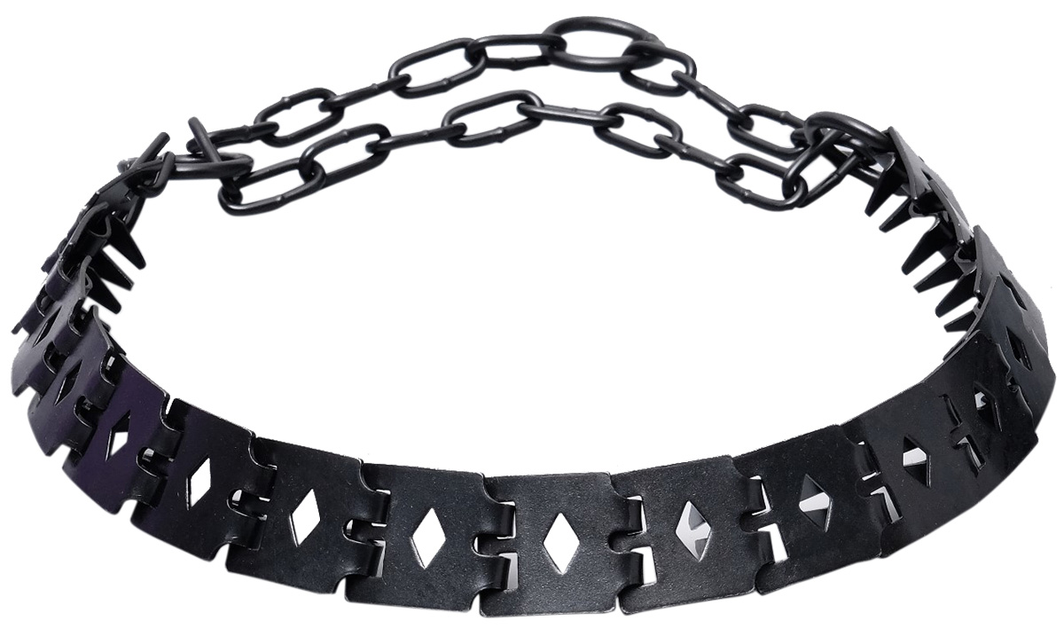 Ошейник из металлических пластин с загнутыми со стороны шеи собаки шипами высотой 1,5 см. Детали ошейника обработаны воронением.