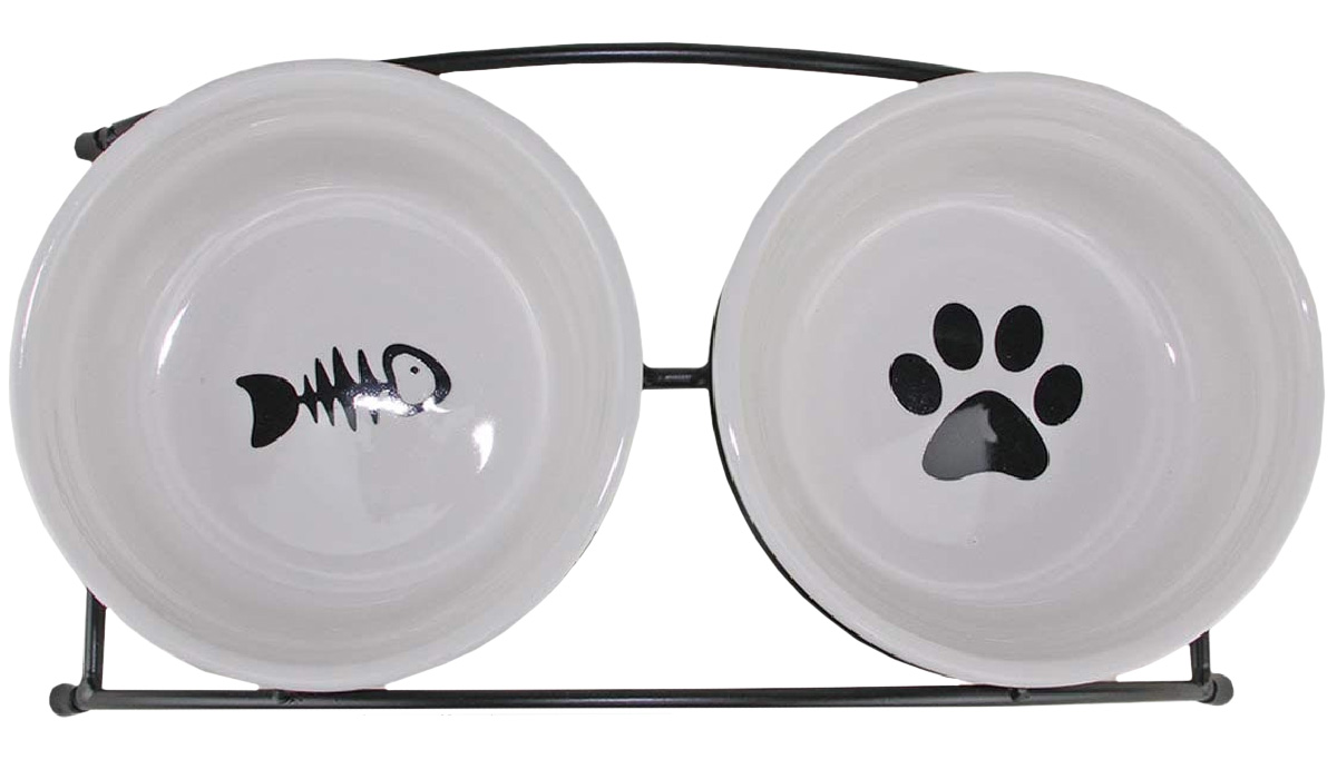 Подставка для животных с керамическими мисками, украшена рисунком рыбьей косточки и лапки на дне.
