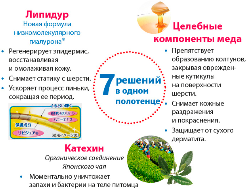 Благодаря входящим в состав ингредиентам полотенца являются универсальным уходовым средством за шерстью и кожей питомца.