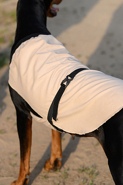 Попона сшита из двух частей, прикрывающих ― и охлаждающих ― спину и грудь собаки.