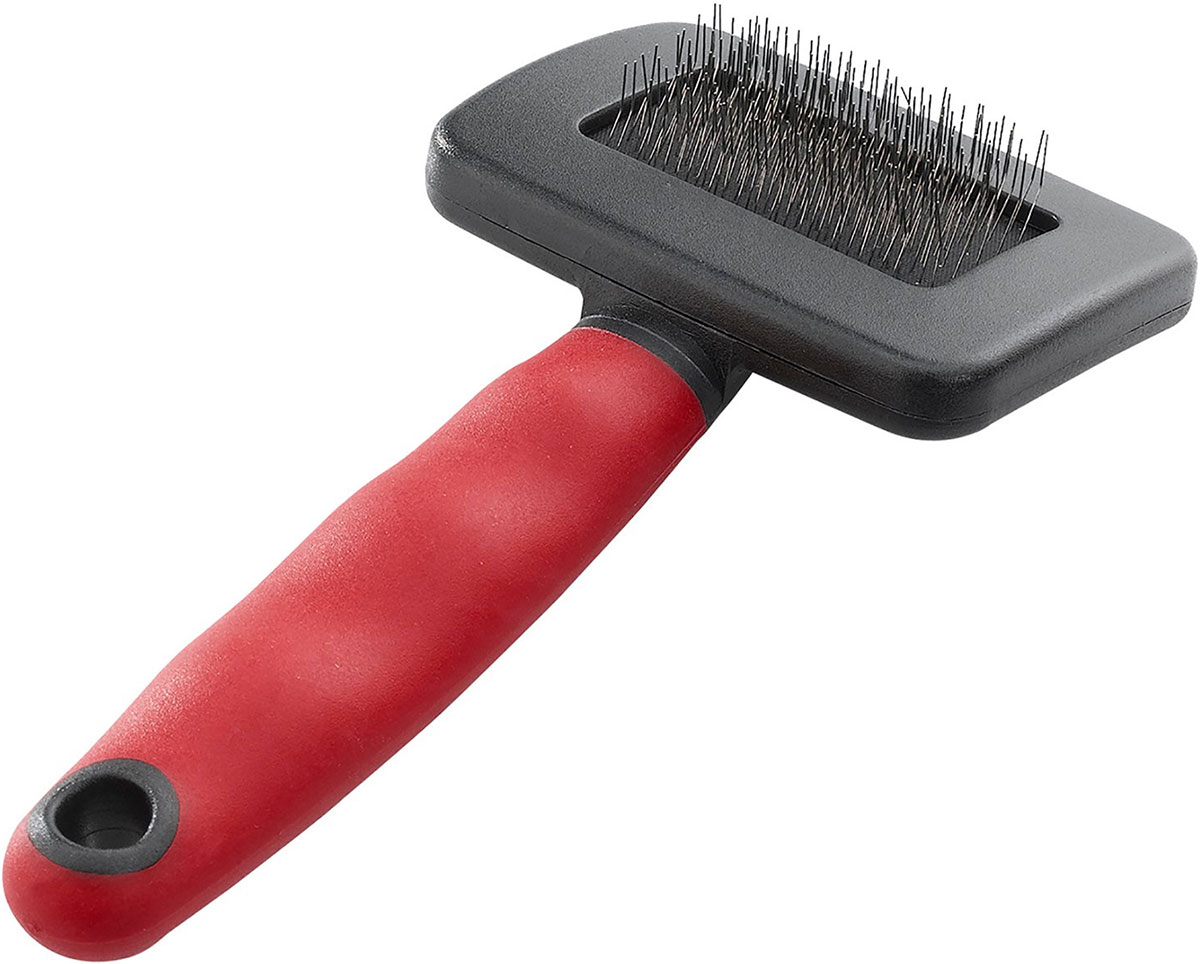 Легкая длинная ручка с небольшими уступами для пальцев облегчает процесс для хозяина, поскольку рука не устает. Поверхность не скользит даже в мокрых руках. Зубчики выполнены из стали, а каждый кончик обработан, чтобы не царапать кожу. Аксессуар легко моется и не ломается, благодаря износоустойчивым материалам. В комплекте вы найдете небольшую металлическую расческу с закругленными концами, форма ручки также сделана, чтобы ею удобно было пользоваться.