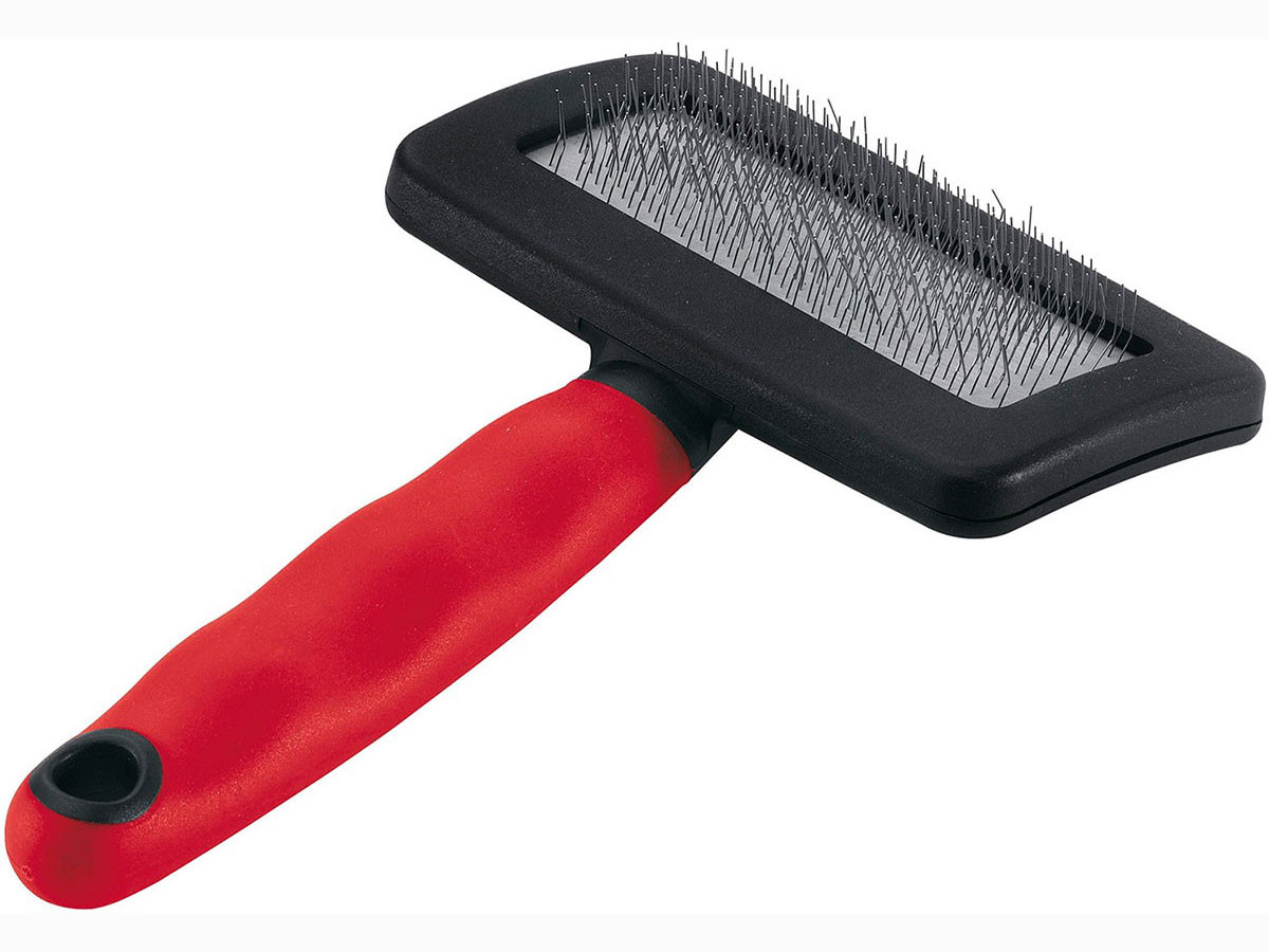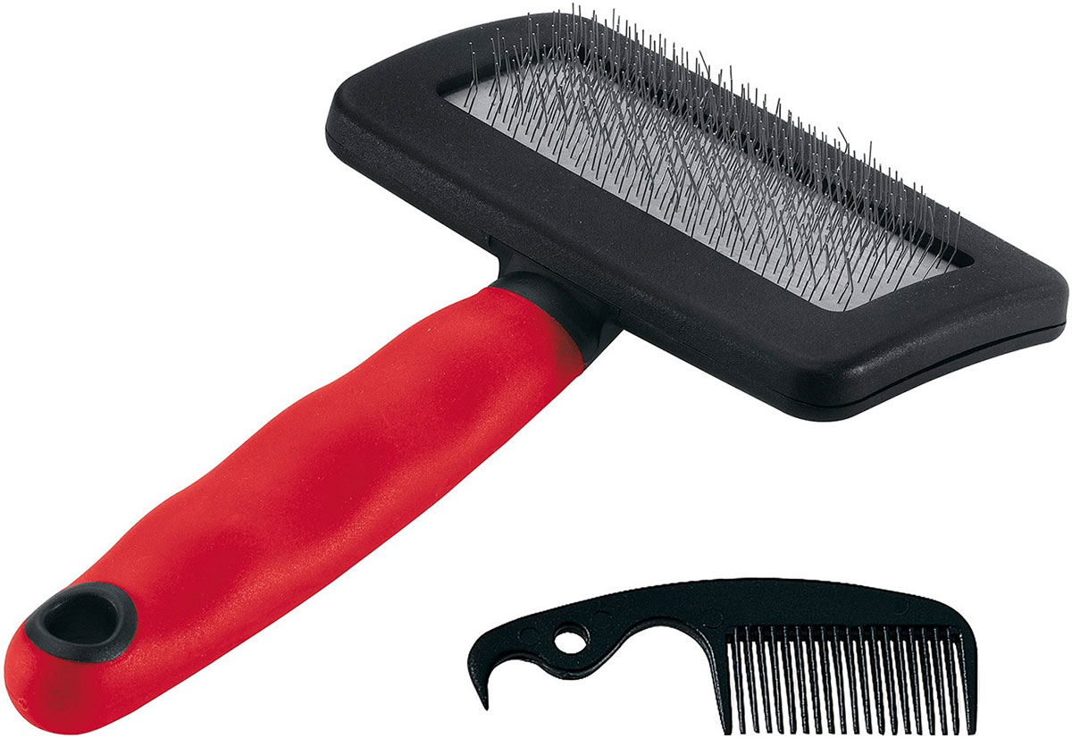 Легкая длинная ручка с небольшими уступами для пальцев облегчает процесс для хозяина, поскольку рука не устает. Поверхность не скользит даже в мокрых руках. Зубчики выполнены из стали, а каждый кончик обработан, чтобы не царапать кожу. Аксессуар легко моется и не ломается, благодаря износоустойчивым материалам. В комплекте вы найдете небольшую металлическую расческу с закругленными концами, форма ручки также сделана, чтобы ею удобно было пользоваться.