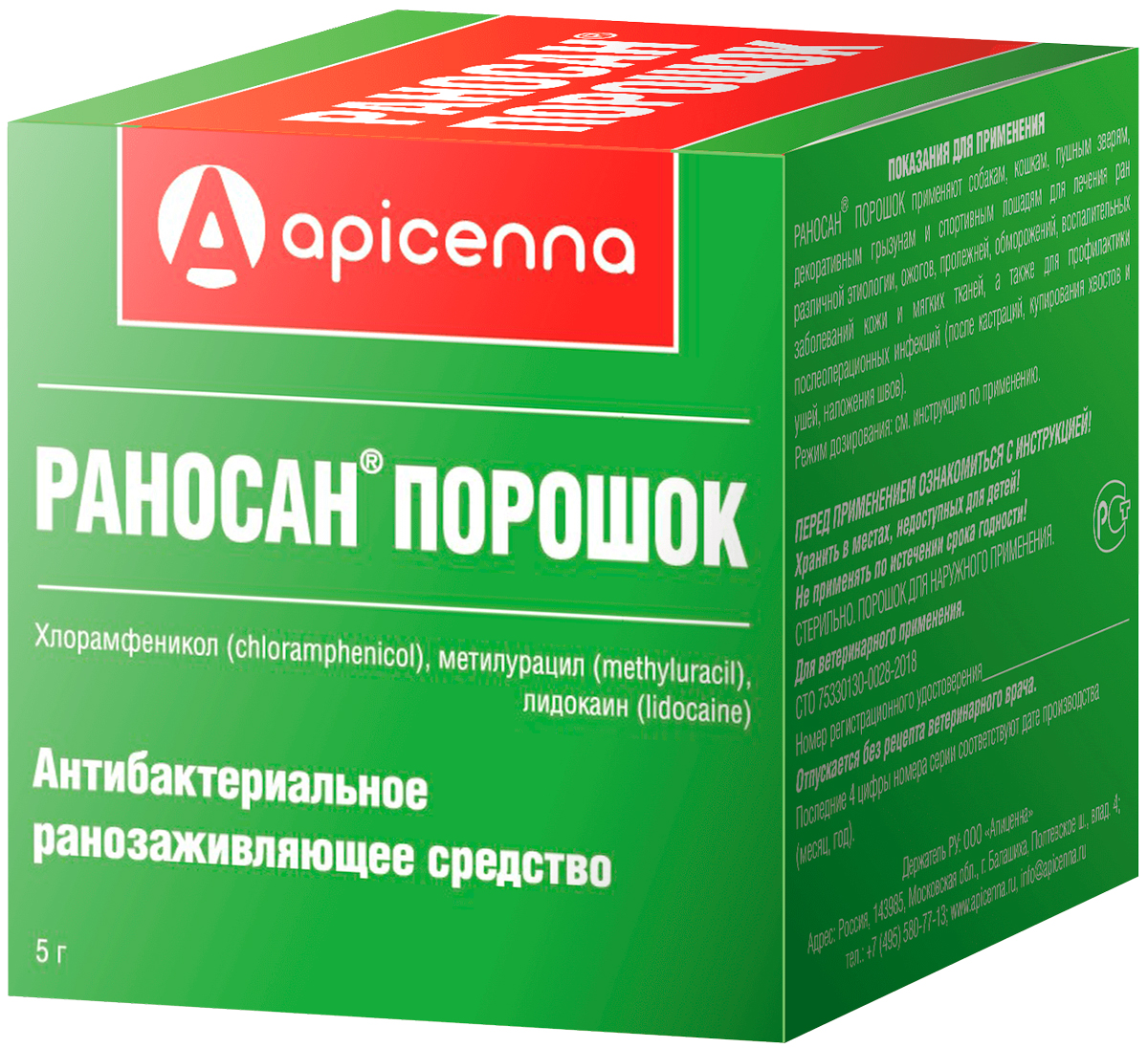 Порошок Раносан применяют для лечения свежих, поверхностных, гнойных, некротических, вяло заживающий, послеоперационных ран (кастрация, кесарево сечение, купирование хвостов и ушей), вульвовагинитах и др. Эффективен для профилактики гнойных осложнений при укусах, ранах и трещинах подушечек лап. Перед употреблением рекомендуется проконсультироваться с ветеринарным врачом.РАНОСАН- бренд компании APICENNA.