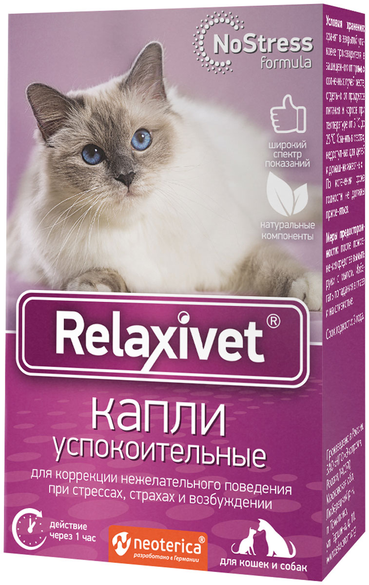 Успокоительные капли быстрого действия RELAXIVET предназначены для коррекции нежелательного поведения при стрессах, страхах и возбуждении у кошек и собак.