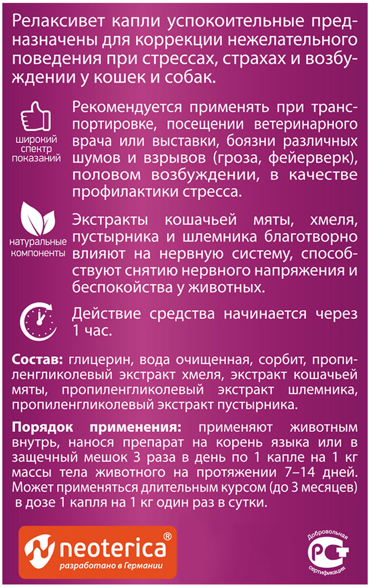 Составы RELAXIVET разработаны компанией Neoterica (Германия).