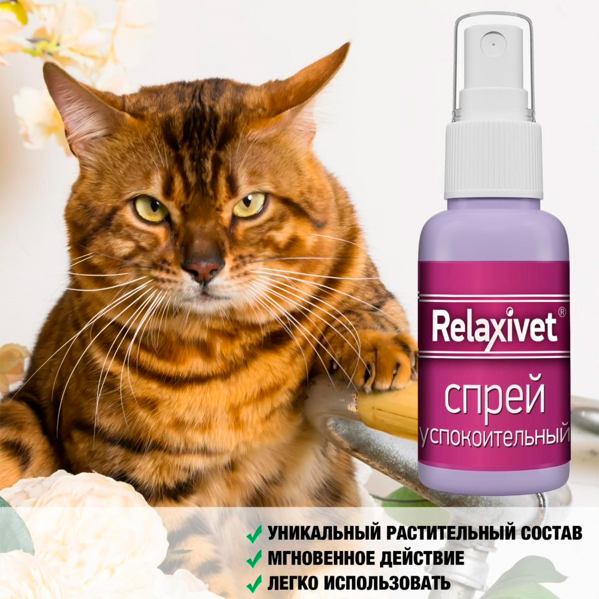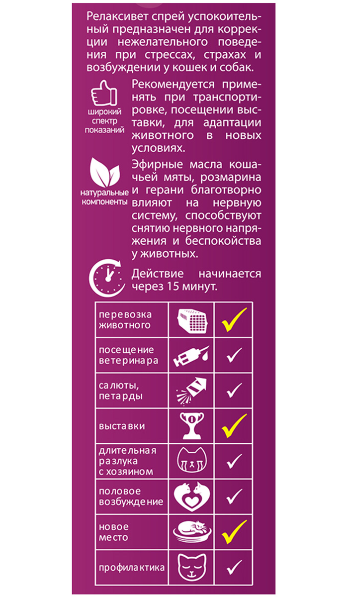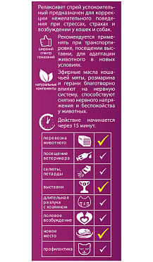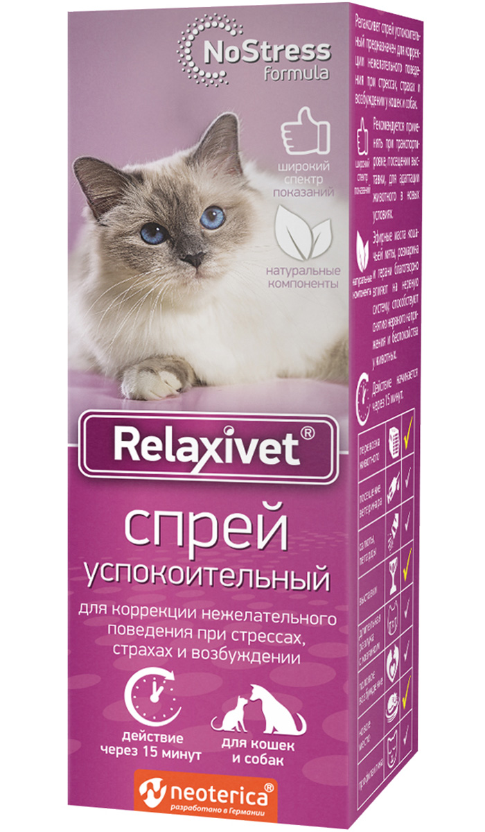 Успокоительный спрей быстрого действия RELAXIVET предназначен для коррекции нежелательного поведения при стрессах, страхах и возбуждении у кошек и собак.