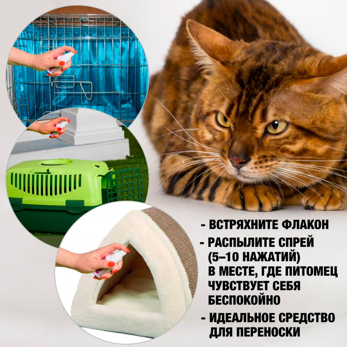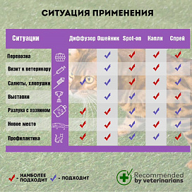 Порядок применения: Перед применением необходимо встряхнуть флакон, затем распылить спрей (5–10 нажатий) в местах, где животное почувствовало беспокойство, а также на переноску во время транспортировки.