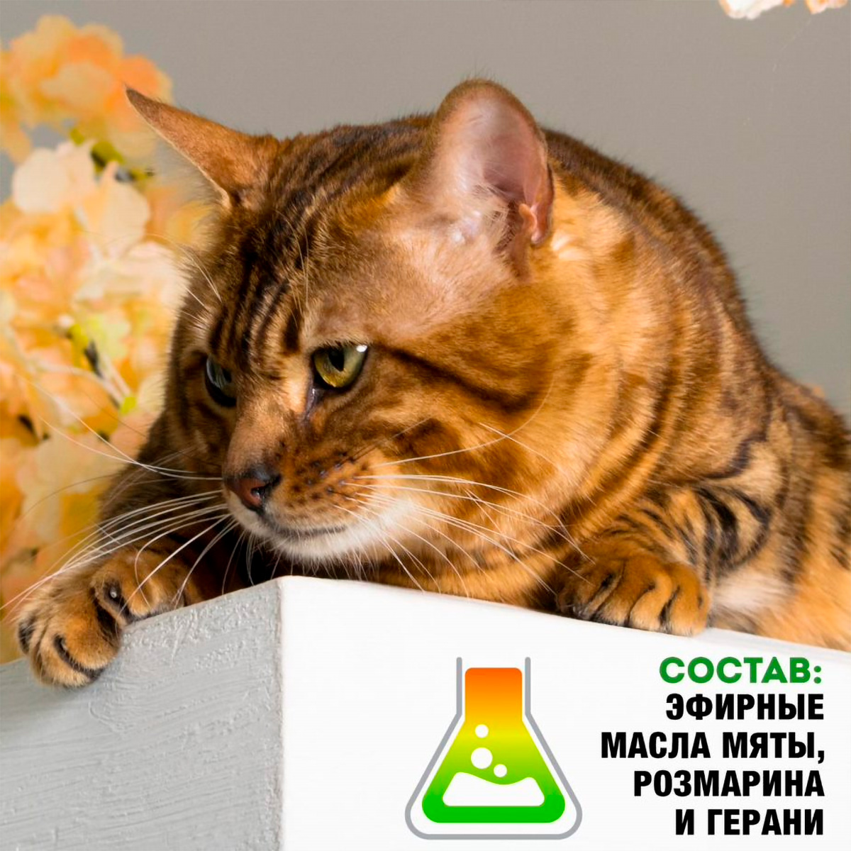 Эфирные масла кошачьей мяты, розмарина и герани благотворно влияют на нервную систему, способствуют снятию нервного напряжения и беспокойства у животных.