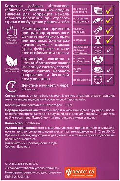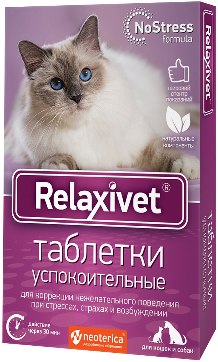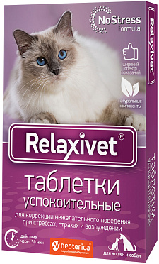 Успокоительные таблетки быстрого действия RELAXIVET, созданные на основе натуральных аминокислот, предназначены для коррекции нежелательного поведения при стрессах, страхах и возбуждении у кошек и собак.