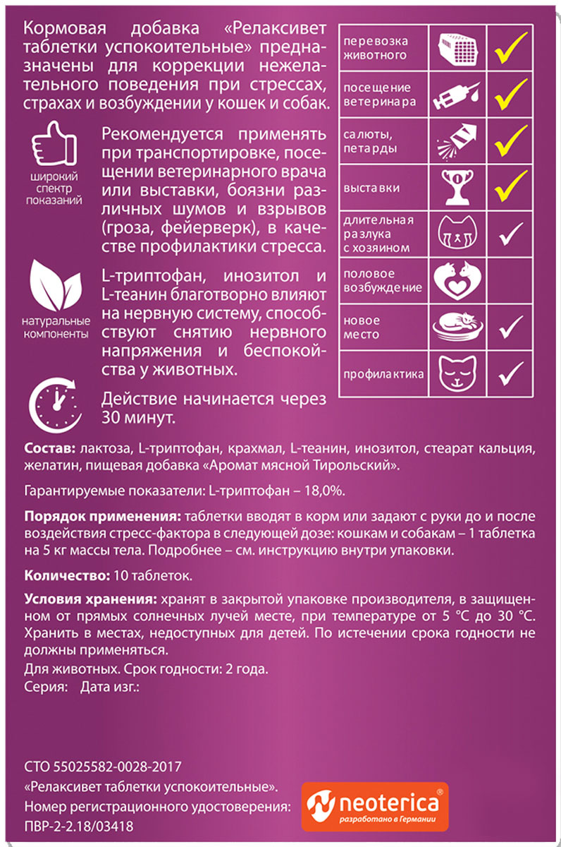 Составы RELAXIVET разработаны компанией Neoterica (Германия).