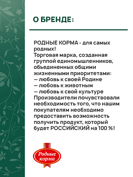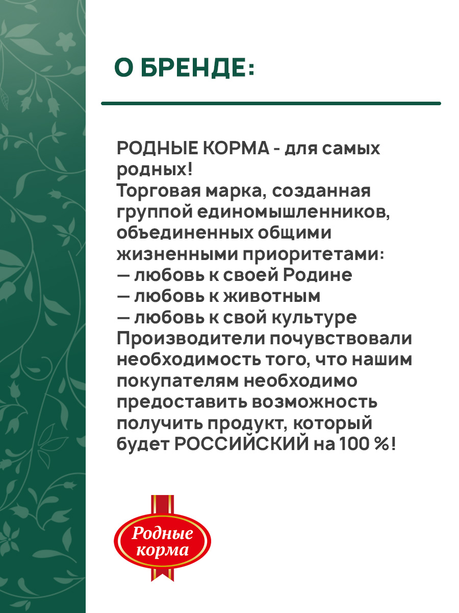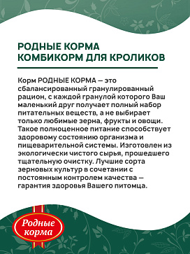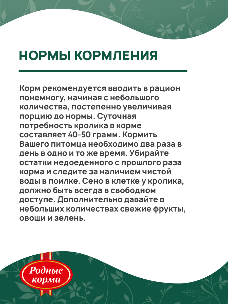 Корм РОДНЫЕ КОРМА — это сбалансированный гранулированный рацион, с каждой гранулой которого Ваш маленький друг получает полный набор питательных веществ, а не выбирает только любимые зерна, фрукты и овощи. Такое полноценное питание способствует здоровому состоянию организма и пищеварительной системы. Изготовлен из экологически чистого сырья, прошедшего тщательную очистку. Лучшие сорта зерновых культур в сочетании с постоянным контролем качества — гарантия здоровья Вашего питомца.