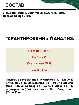 Состав: Люцерна, зерно, масличные культуры, соль кормовая, премикс.