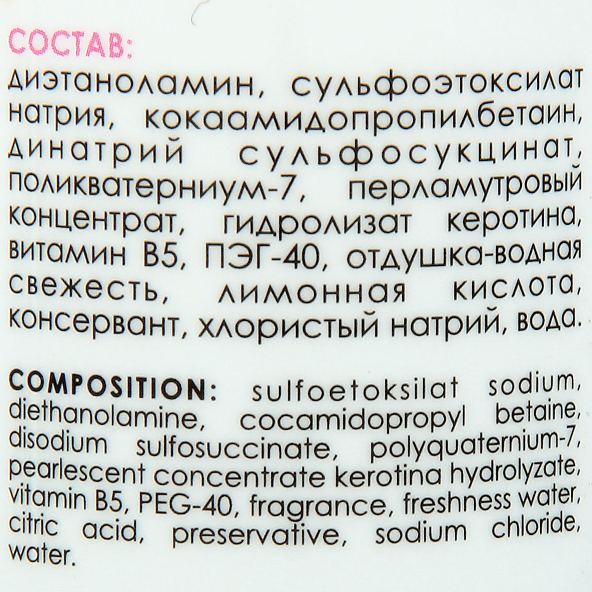 Состав: вода, лауретсульфат натрия, кокоамидопропилбетаин, динатрия сульфосукцинат, диэтаноламид ж.к., натрий хлор, поликватерниум 7, ПЭГ-40, витамин В 5, перламутровый концентрат, лимонная кислота, консервант, отдушка – зелёная трава.