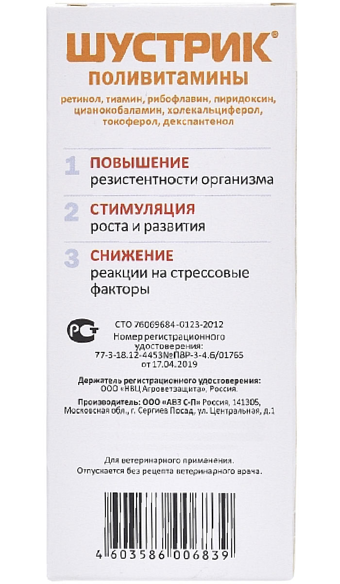 В качестве активных действующих веществ содержит в 1 мл: витамина А – 220 МЕ, витамина В1 – 0,1 мг, витамина В2 – 0,15 мг, витамина В6 – 0,2 мг, витамина В12 – 1,0 мкг; витамина D3 – 20 МЕ, витамина Е – 0,25 мг и Д-пантенола – 0,2 мг. Препарат является концентрированным водным раствором витаминов, в котором витамины А, В1, В2, В6, В12, D3, Е и Д-пантенол находятся в физиологически обоснованных соотношениях.