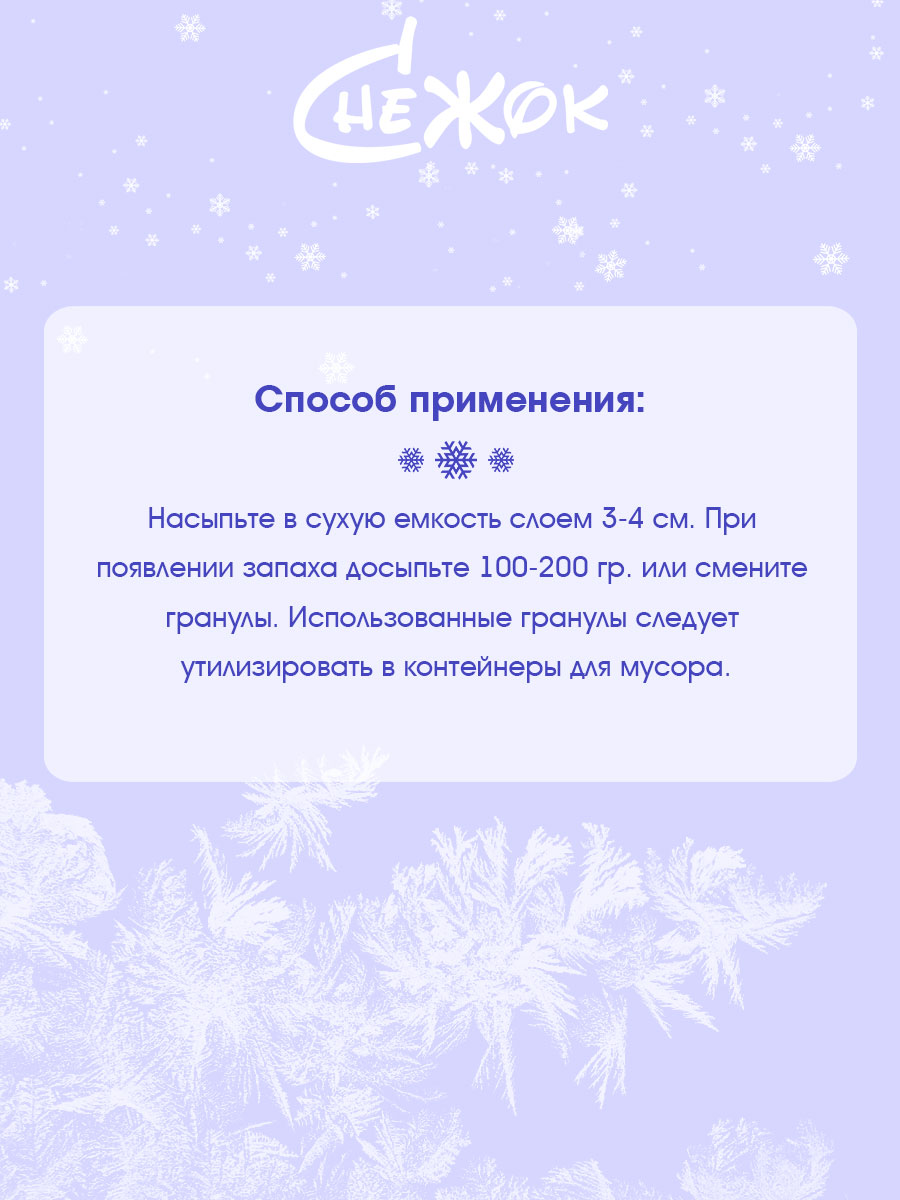Способ применения: насыпьте в сухую емкость слоем 3-4 см. При появлении запаха досыпьте 100-200 гр. или смените гранулы. Использованные гранулы следует утилизировать в контейнеры для мусора.