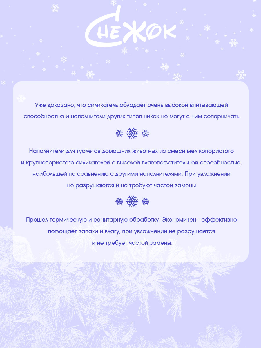 "Снежок – Силикагель" - наполнитель из смеси мелкопористого и крупнопористого силикагелей с высокой влагопоглотительной способностью.