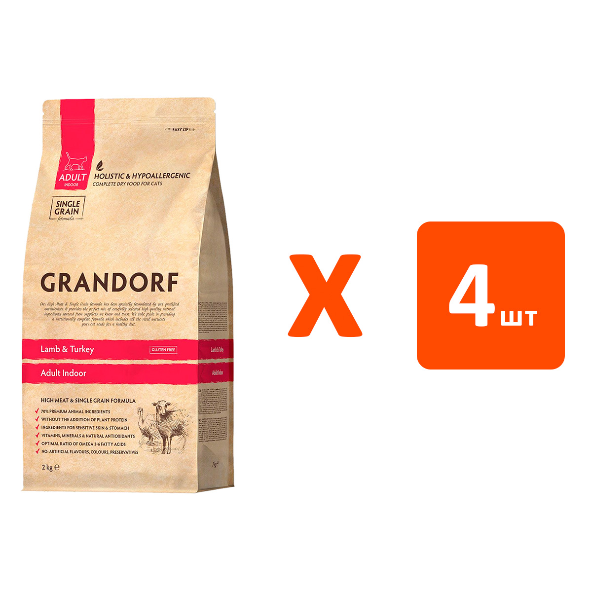 Сухой корм для домашних кошек GRANDORF SINGLE GRAIN CAT ADULT INDOOR низкозерновой ягненок, индейка (2 кг х 4 шт)
