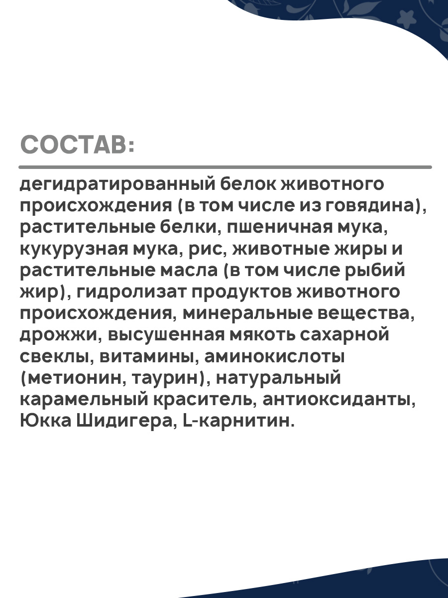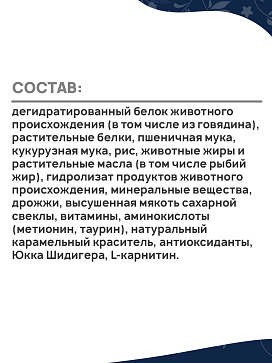 Состав: дегидратированный белок животного происхождения (в том числе из говядина), растительные белки, пшеничная мука, кукурузная мука, рис, животные жиры и растительные масла (в том числе рыбий жир), гидролизат продуктов животного происхождения, минеральные вещества, дрожжи, высушенная мякоть сахарной свеклы, витамины, аминокислоты (метионин, таурин), натуральный карамельный краситель, антиоксиданты, Юкка Шидигера, L-карнитин.