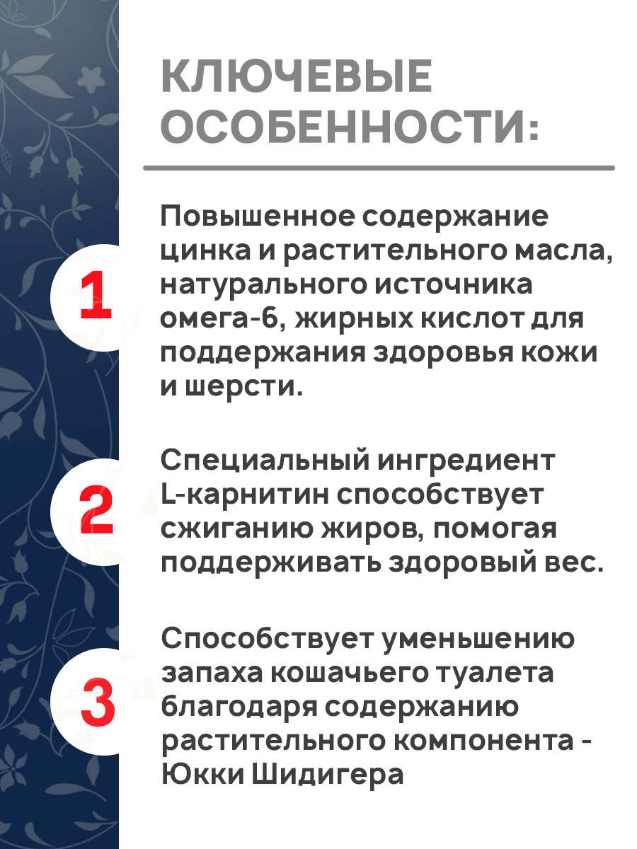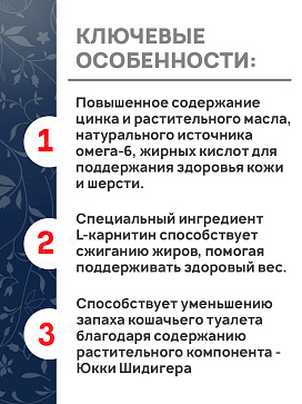 - Повышенное содержание цинка и растительного масла , натурального источника омега-6, жирных кислот для поддержания здоровья кожи и шерсти.