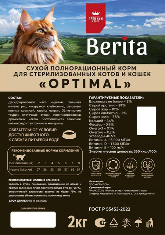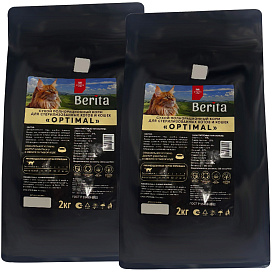Сухой корм для кастрированных котов и стерилизованных кошек BERITA OPTIMAL (2 + 2 кг)