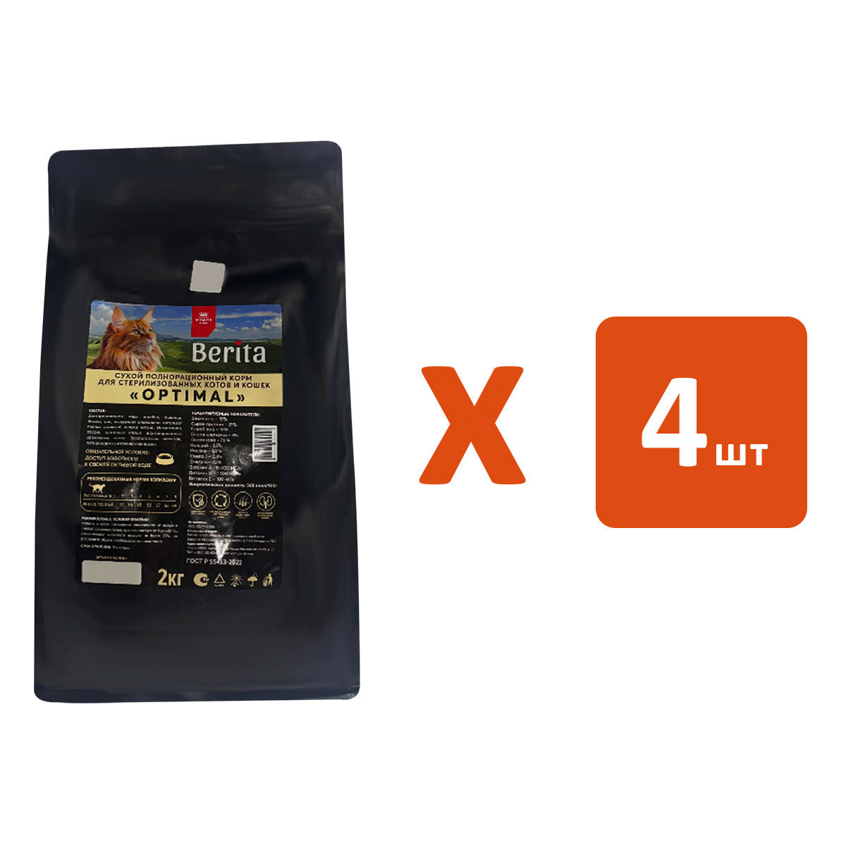 Сухой корм для кастрированных котов и стерилизованных кошек BERITA OPTIMAL (2 кг х 4 шт)