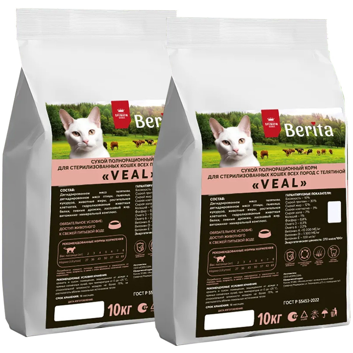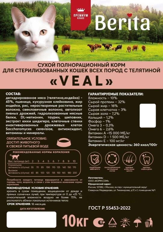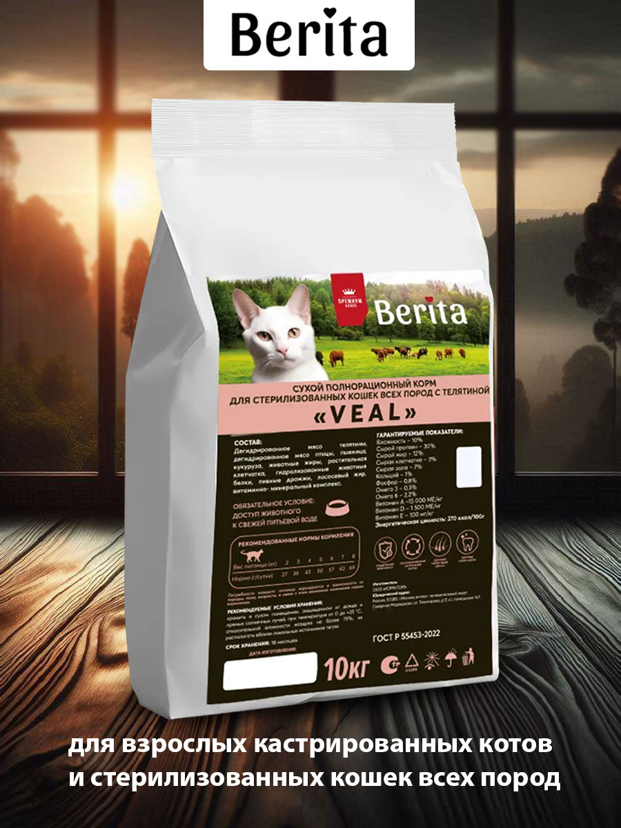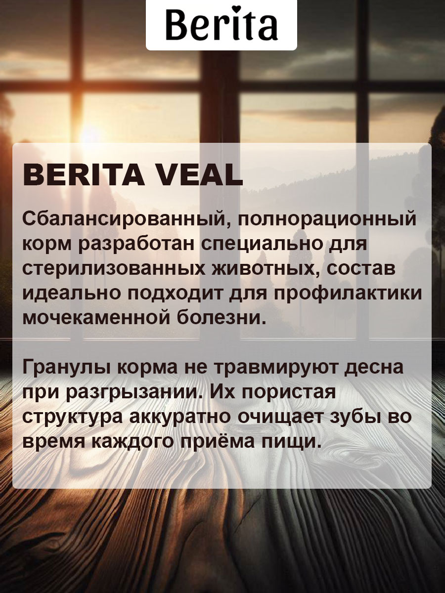 Сухой корм для кастрированных котов и стерилизованных кошек BERITA VEAL телятина (10 + 10 кг)