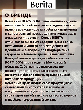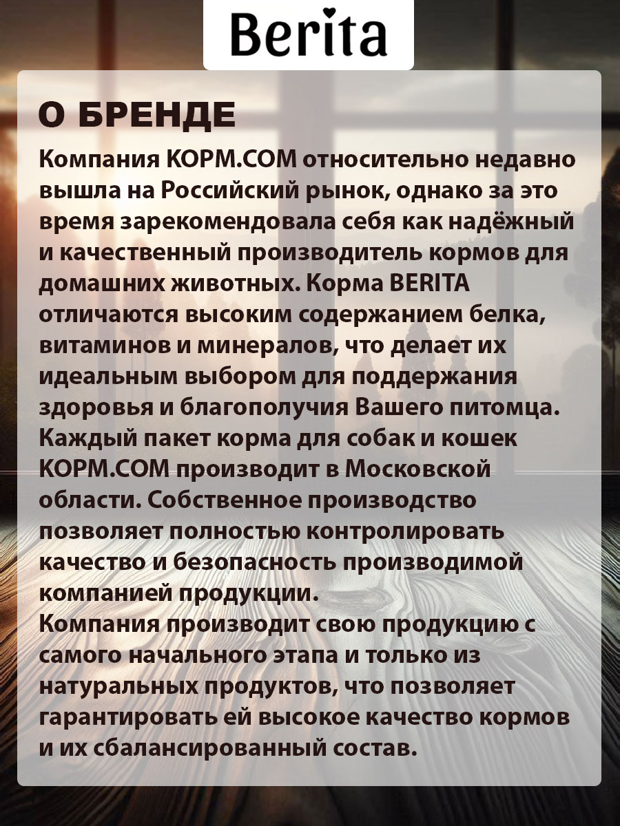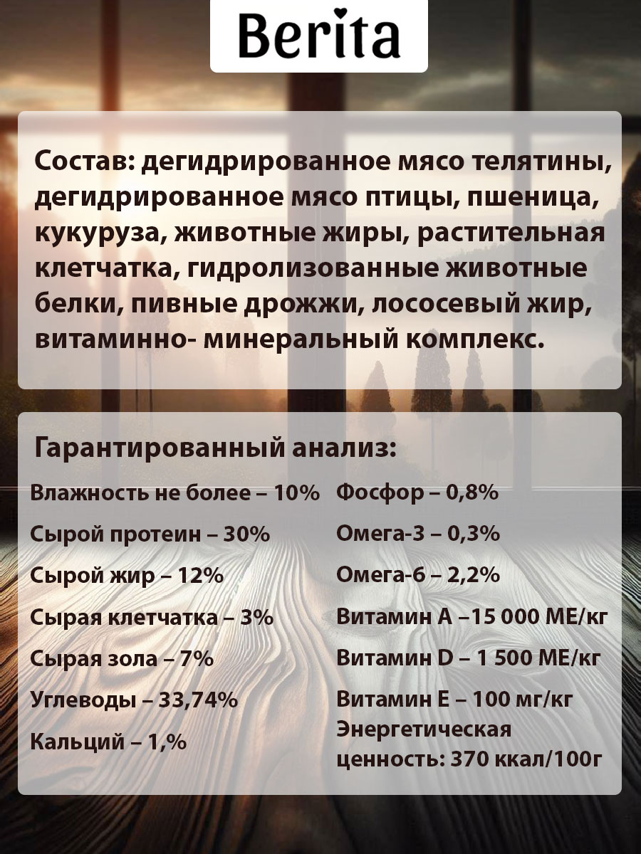 Состав: дегидрированное мясо телятины, дегидрированное мясо птицы, пшеница, кукуруза, животные жиры, растительная клетчатка, гидролизованные животные белки, пивные дрожжи, лососевый жир, витаминно- минеральный комплекс.
