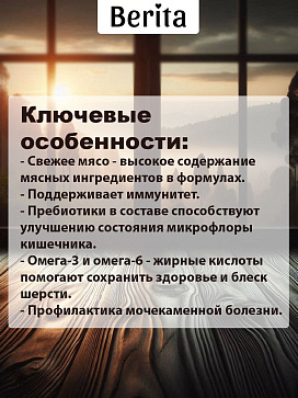 - Свежее мясо - высокое содержание мясных ингредиентов в формулах.