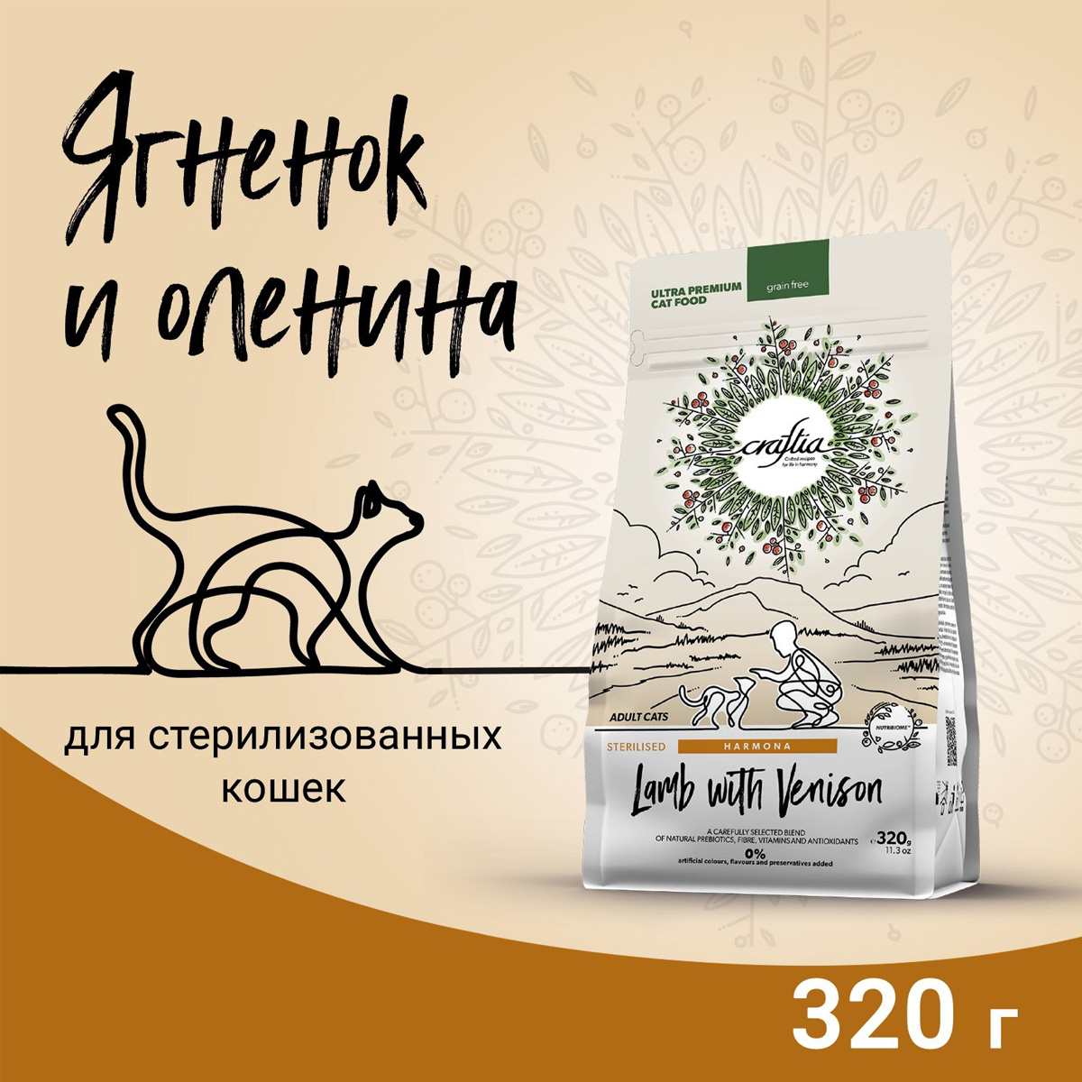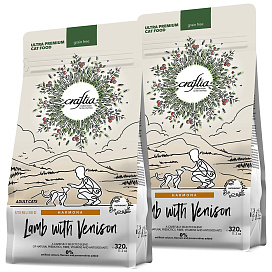 Сухой корм для кастрированных котов и стерилизованных кошек CRAFTIA HARMONA GRAIN FREE STERILISED ADULT CAT LAMB & WITH VENISON беззерновой ягненок, оленина (0,32 + 0,32 кг)