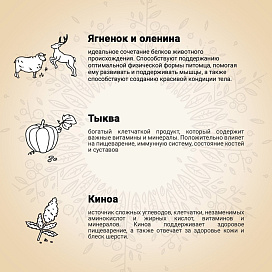 Основные источники белка в корме — свежее мясо ягненка и оленя. Комбинация этих белков легко переваривается, помогает поддерживать оптимальный вес питомца, стабилизирует обмен веществ. Ягненок и оленина — отличные источники незаменимых аминокислот, витаминов и минералов. Углеводы в корме представлены легкоусвояемыми беззлаковыми источниками: гороховым крахмалом и семянами киноа.