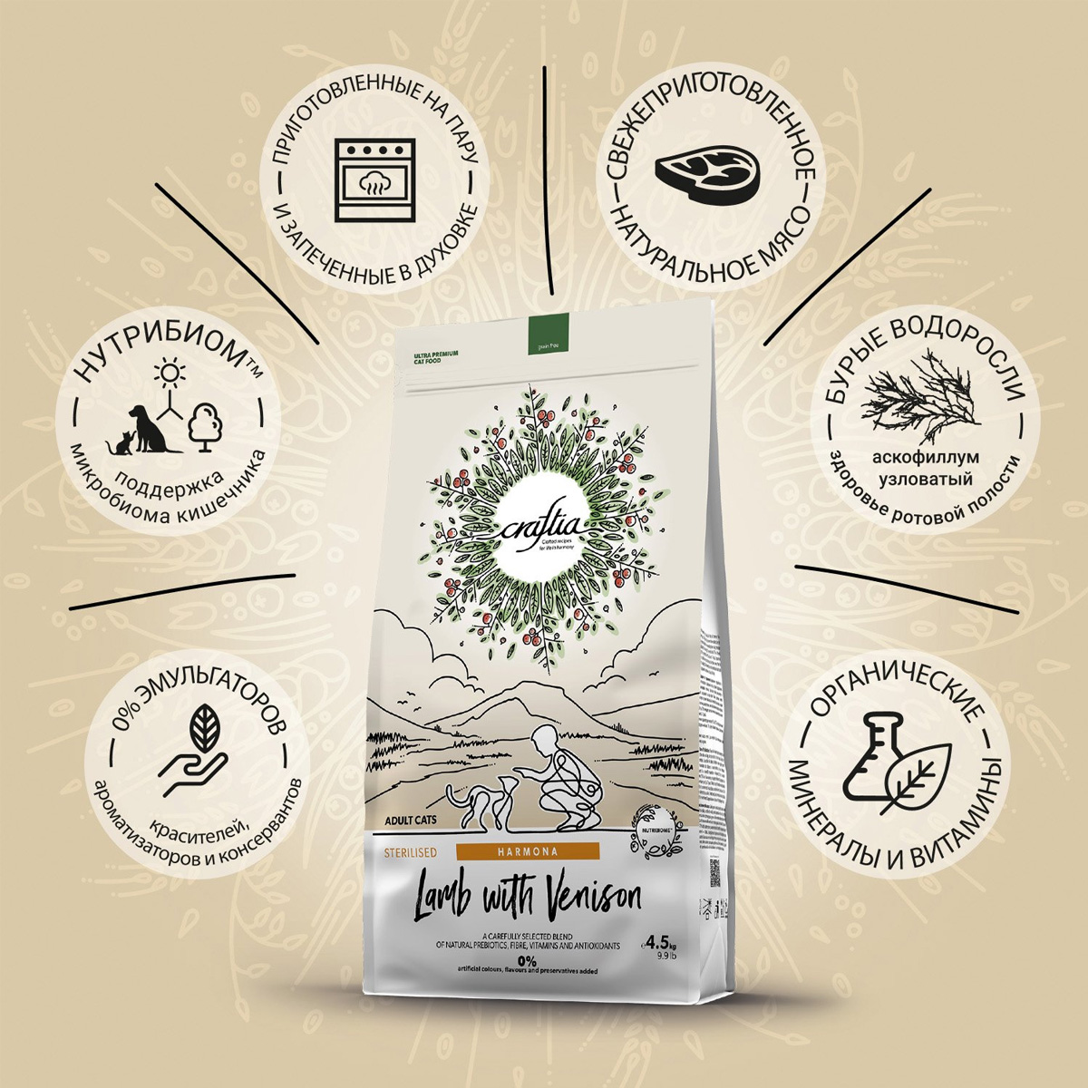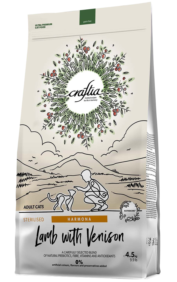 Сухой корм для кастрированных котов и стерилизованных кошек CRAFTIA HARMONA GRAIN FREE STERILISED ADULT CAT LAMB & WITH VENISON беззерновой ягненок, оленина (4,5 кг)