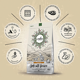 Состав: сырой бескостный ягненок (26%), гороховый крахмал, гидролизованный белок оленины (10%), дегидратированный белок курицы, дегидратированный белок сельди, гидролизованный белок птицы (курица, индейка), куриный жир, экстракт семян киноа (4%), сухая свекольная пульпа, гидролизованный белок рыбы (треска, пикша), рыбий жир (из лосося), куриные потроха (печень, сердце, почки), сухое яйцо (куриное), люцерновая мука, волокна гороха, сушеное яблоко (0,5%), сушеная тыква (0,5%), льняное семя, карбонат кальция, монокальцийфосфат, хлорид калия, инулин цикория (0,4%), дрожжевой экстракт (источник маннанолигосахаридов) (0,3%), фруктоолигосахариды (0,3%), аскофиллум узловатый (Ascophyllum Nodosum), сухие пивные дрожжи, хлорид натрия, сушеная вишня, сушеная черника, сушеная клюква, сушеная спаржа, алоэ вера, розмарин, куркума, календула, шелуха и семена подорожника, юкка Шидигера.