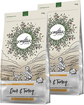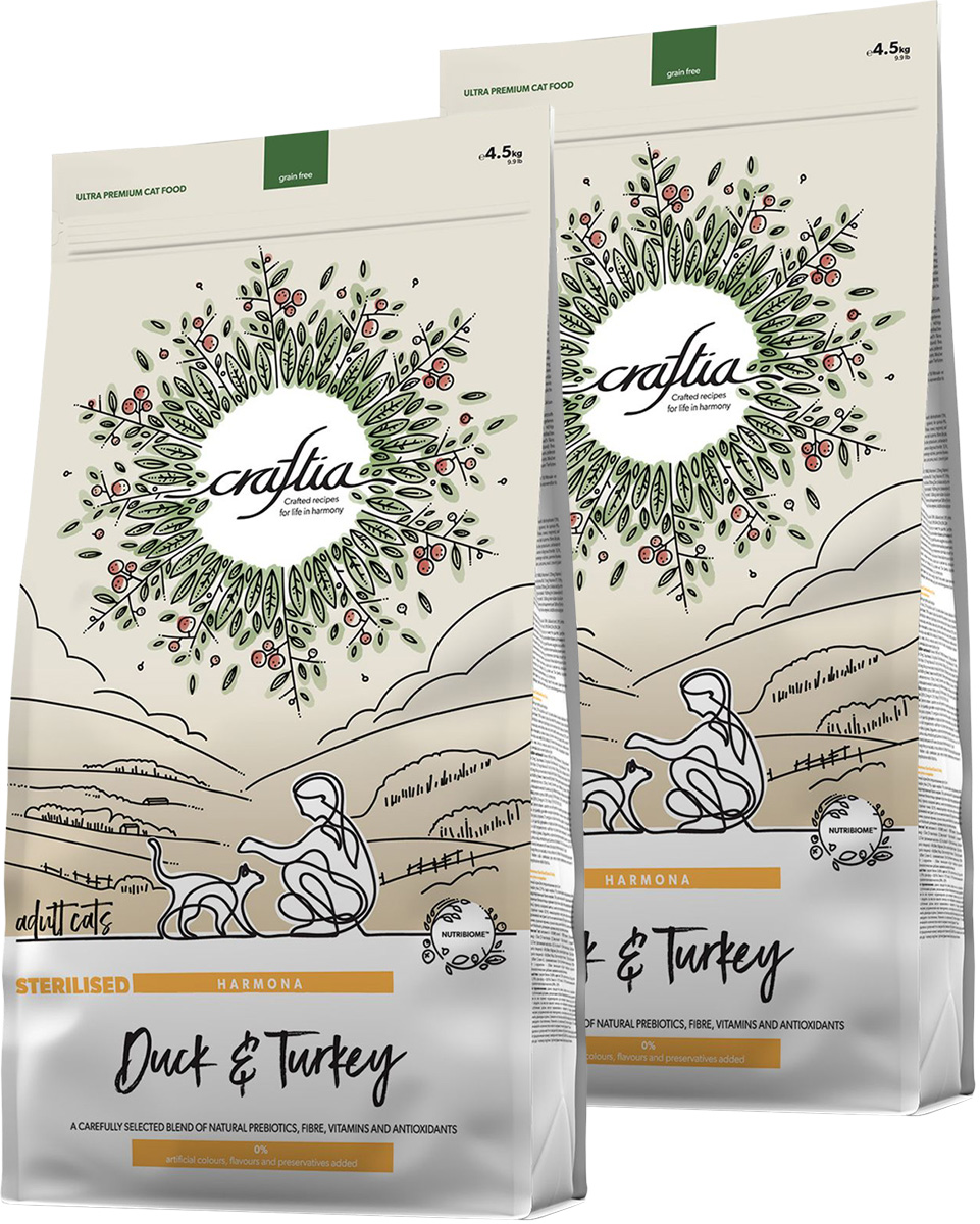 Сухой корм для кастрированных котов и стерилизованных кошек CRAFTIA HARMONA GRAIN FREE STERILISED ADULT беззерновой утка, индейка (4,5 + 4,5 кг)