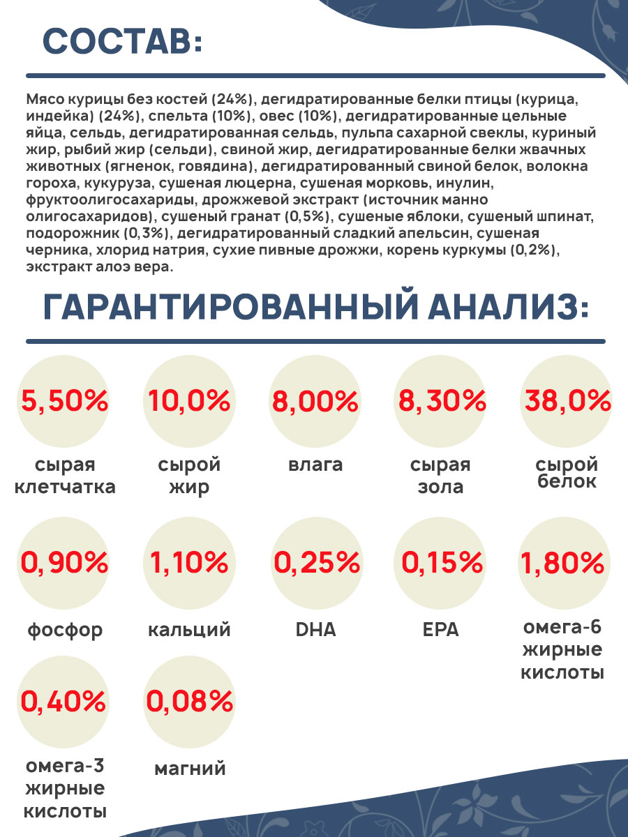 Мясо курицы без костей (24%), дегидратированные белки птицы (курица, индейка) (24%), спельта (10%), овес (10%), дегидратированные цельные яйца, сельдь, дегидратированная сельдь, пульпа сахарной свеклы, куриный жир, рыбий жир (сельди), свиной жир, дегидратированные белки жвачных животных (ягненок, говядина), дегидратированный свиной белок, волокна гороха, кукуруза, сушеная люцерна, сушеная морковь, инулин, фруктоолигосахариды, дрожжевой экстракт (источник маннoолигосахаридов), сушеный гранат (0,5%), сушеные яблоки, сушеный шпинат, подорожник (0,3%), дегидратированный сладкий апельсин, сушеная черника, хлорид натрия, сухие пивные дрожжи, корень куркумы (0,2%), экстракт алоэ вера.