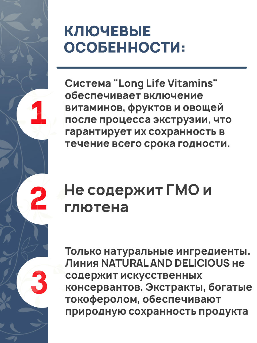 - Система "Long Life Vitamins" обеспечивает включение витаминов, фруктов и овощей после процесса экструзии, что гарантирует их сохранность в течение всего срока годности.