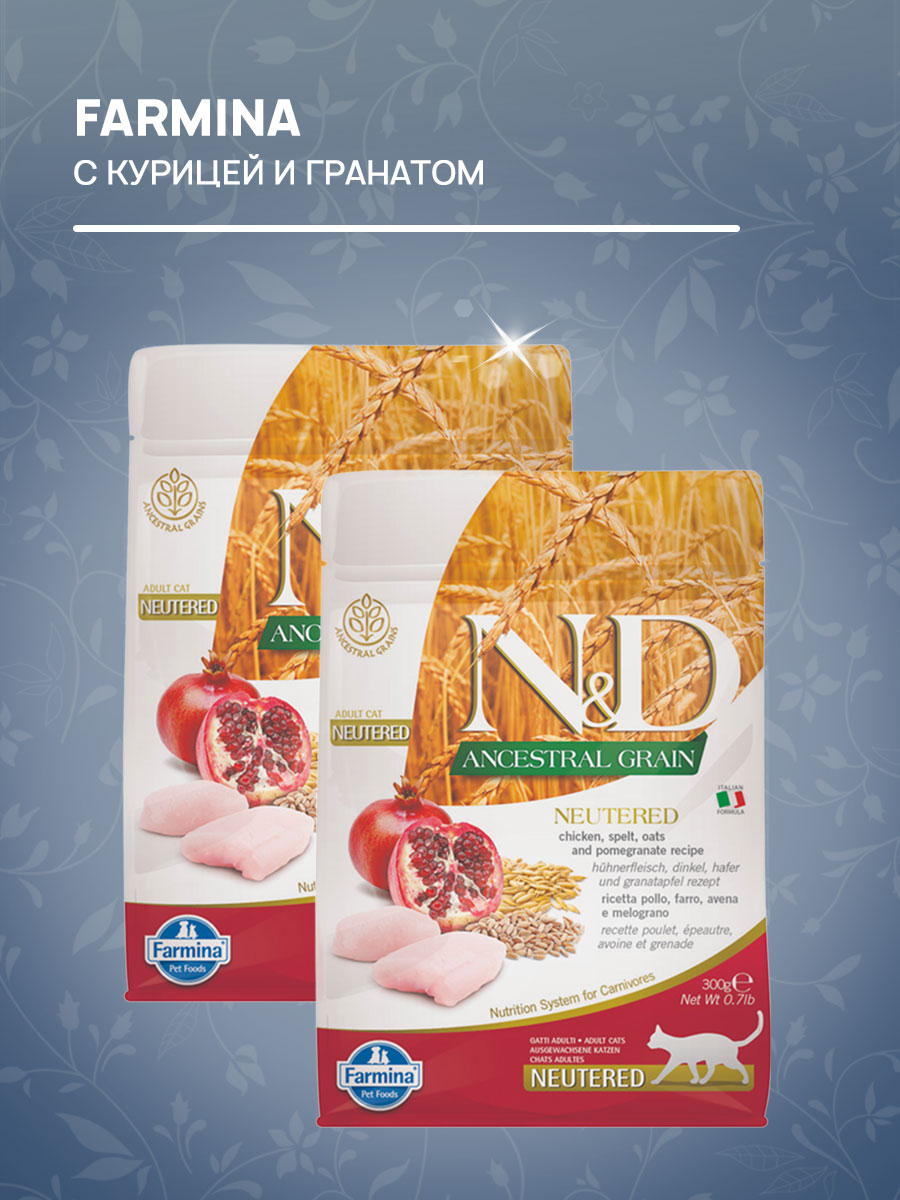 Сухой корм для кастрированных котов и стерилизованных кошек FARMINA N&D ANCESTRAL GRAIN NEUTERED низкозерновой курица, гранат (0,3 кг х 4 шт)