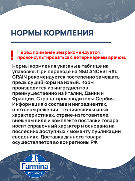Нормы кормления указаны в таблице на упаковке. При переводе на N&D ANCESTRAL GRAIN рекомендуется постепенно замещать предыдущий корм на новый. Корм производится из ингредиентов преимущественно из Италии, Дании и Франции.