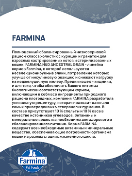 FARMINA N&D ANCESTRAL GRAIN - линейка кормов Farmina, в которой используются неселекционируемые злаки, потребление которых улучшают инсулиновую реакцию и снижают нагрузку на поджелудочную железу.