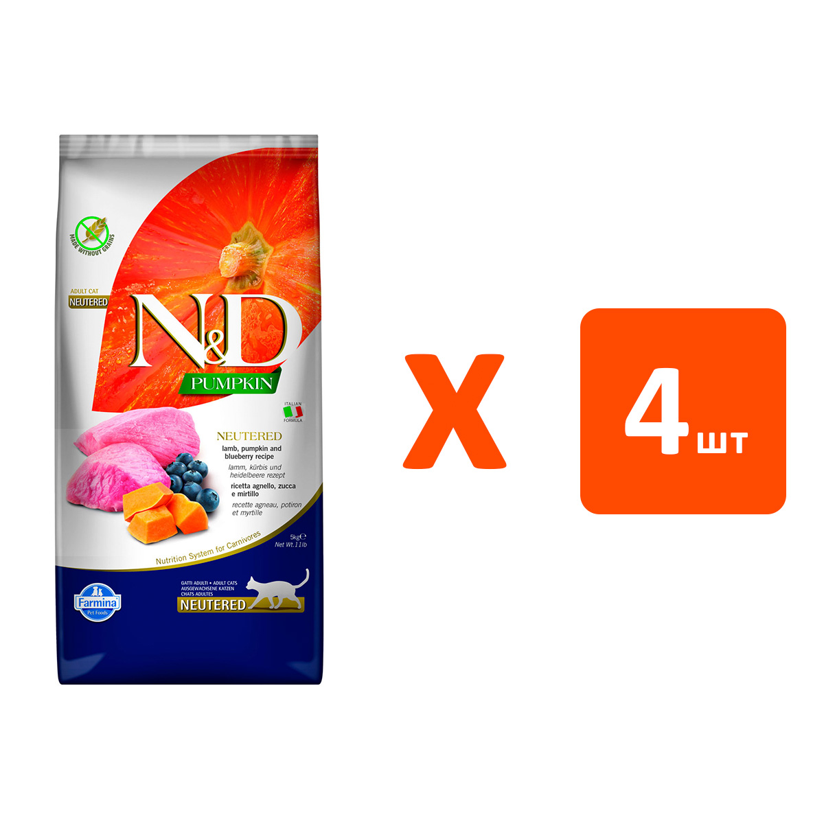 Сухой корм для кастрированных котов и стерилизованных кошек FARMINA N&D GRAIN FREE PUMPKIN NEUTERED беззерновой ягненок, черника, тыква (5 кг х 4 шт)