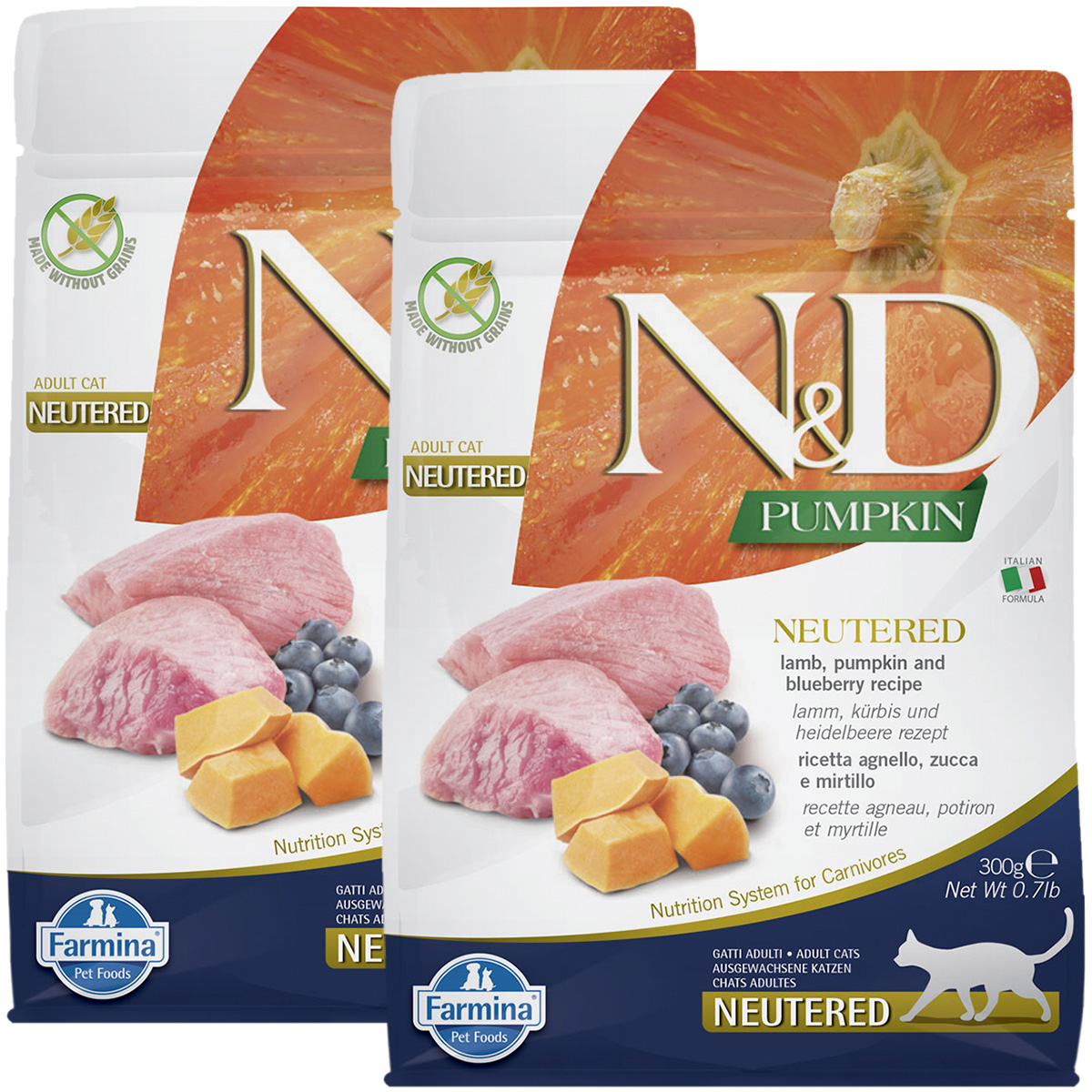 Сухой корм для кастрированных котов и стерилизованных кошек FARMINA N&D GRAIN FREE PUMPKIN NEUTERED беззерновой ягненок, черника, тыква (0,3 + 0,3 кг)